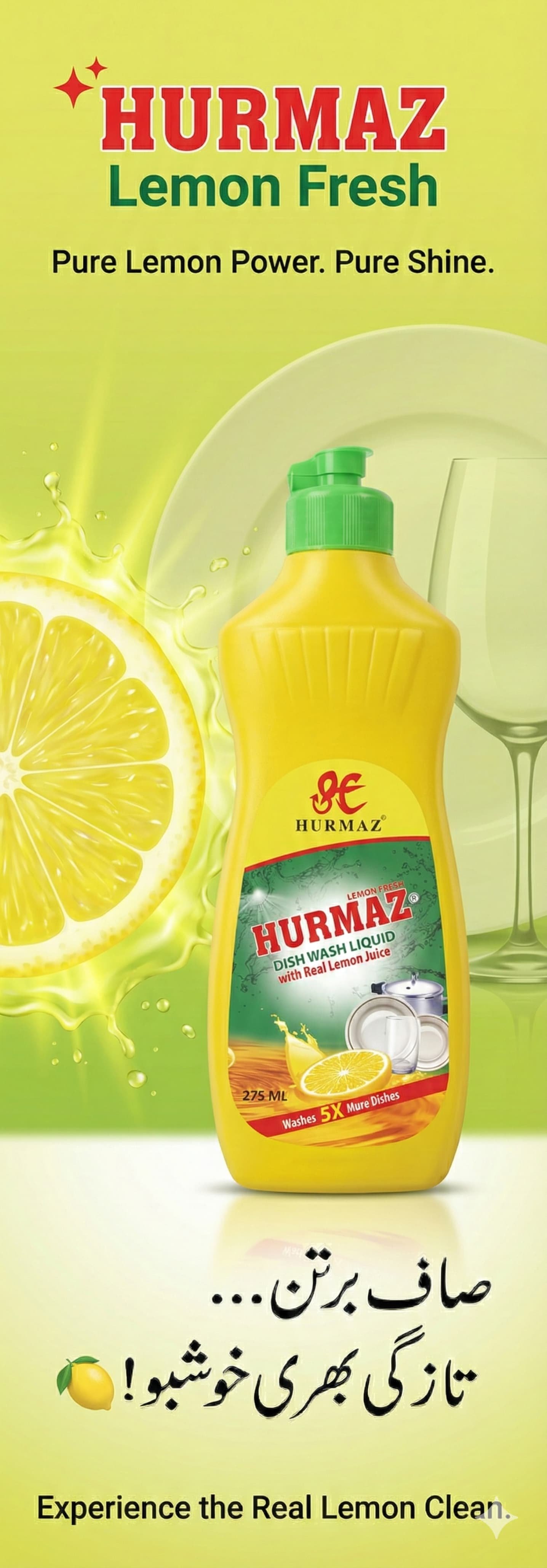 🍋 Hurmaz Lemon Fresh Dish Wash 🍋 سخت سے سخت چکنائی کو لمحوں میں ختم کرے ✨ ہر برتن کو دے شیشے جیسی چمک اور لیموں کی تازہ خوشبو 🌿 کم مقدار، زیادہ صفائی — روزمرہ کچن کے لیے بہترین انتخاب 💛